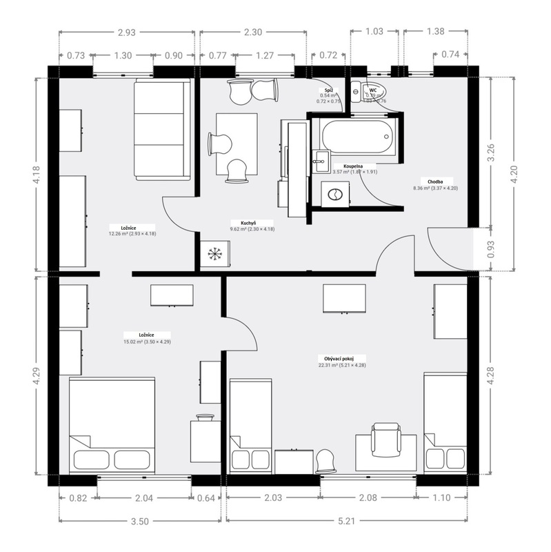 Dispozice: kuchyně 9,78 m², obývací pokoj 20,7 m², pokoj 14,6 m², pokoj