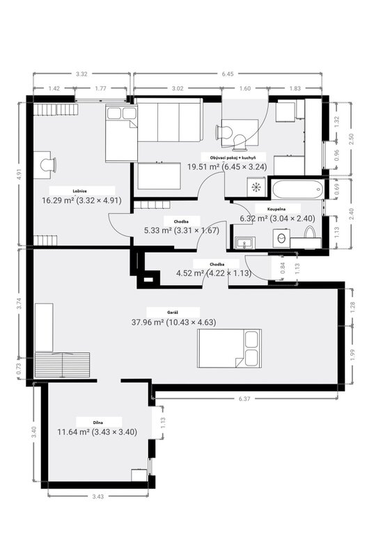 dále zahrnuje garáž, částečně podsklepený prostor a stodolu. Do