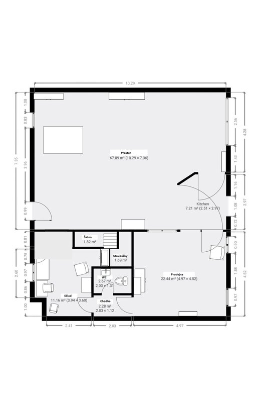 velkým výlohám na ulici. Celková plocha cca 108 m2, prostory se nachází