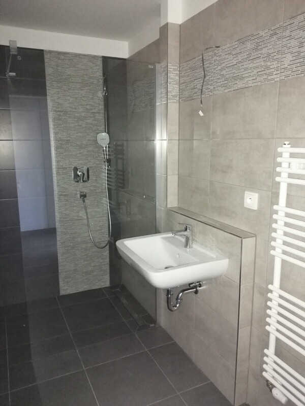 koupelna se sprchovým koutem, umyvadlem, toaletou a místem pro pračku a