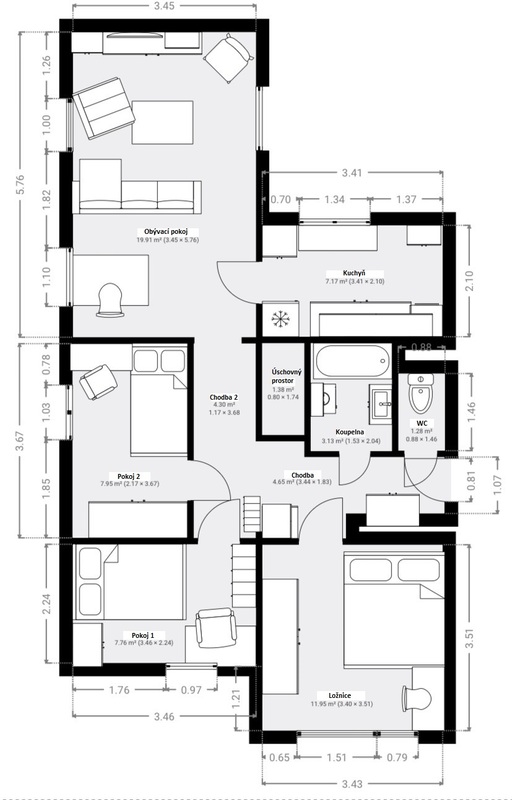 místem pro pračku, samostatné WC, úložný prostor vedle koupelny